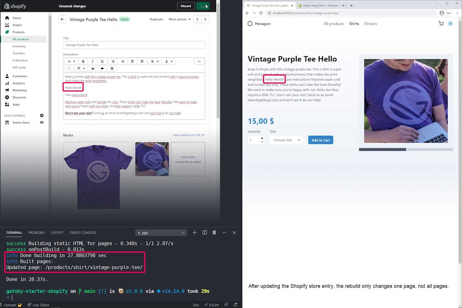 Take a project powered by Shopify as an example. You have your listing of all products and then individual product pages. When you change one single product, only that page should be rebuilt. In the screenshot below you can see exactly that (the sentence “Hello World” was added to the description):