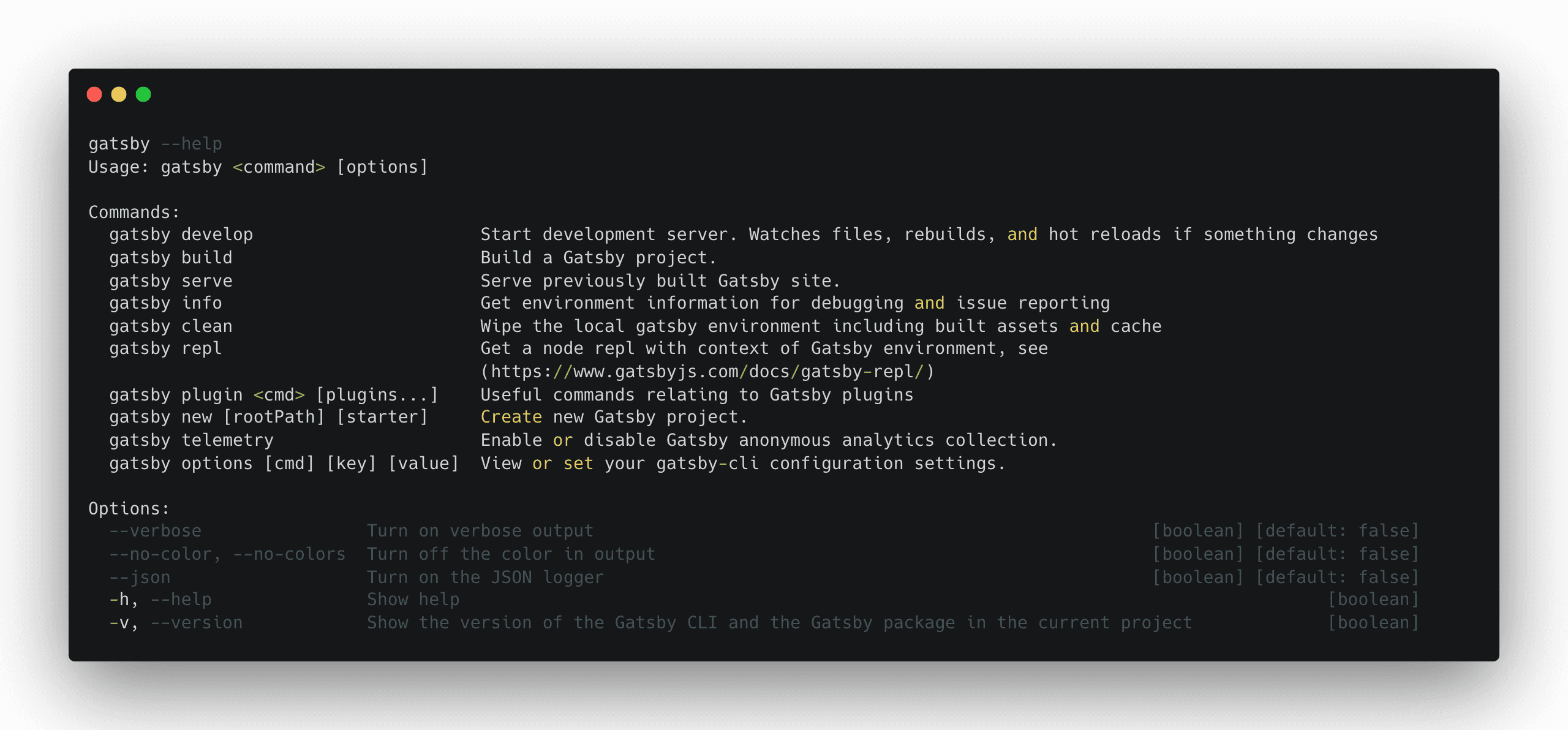 Note: When you install Gatsby and run it for the first time, you’ll see a short message notifying you about anonymous usage data that is being collected for Gatsby commands. You can read more about how that data is pulled out and used in the telemetry doc.