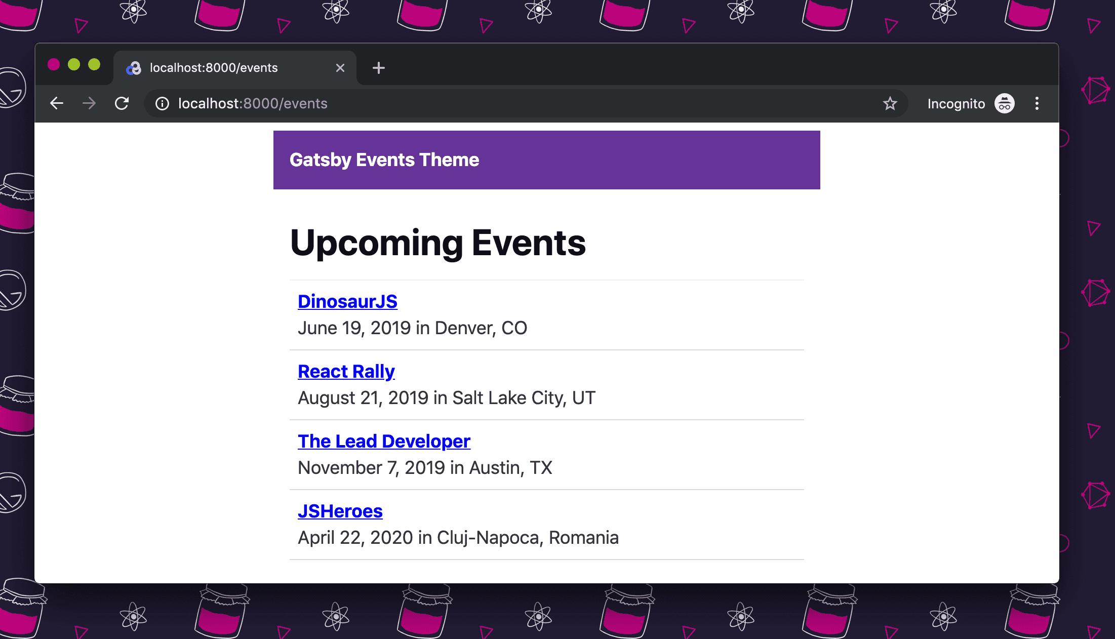 themeimport from@jlengstorf/gatsby-theme-eventsis the base UI theme from@jlengstorf/gatsby-theme-events. - The new object exported from