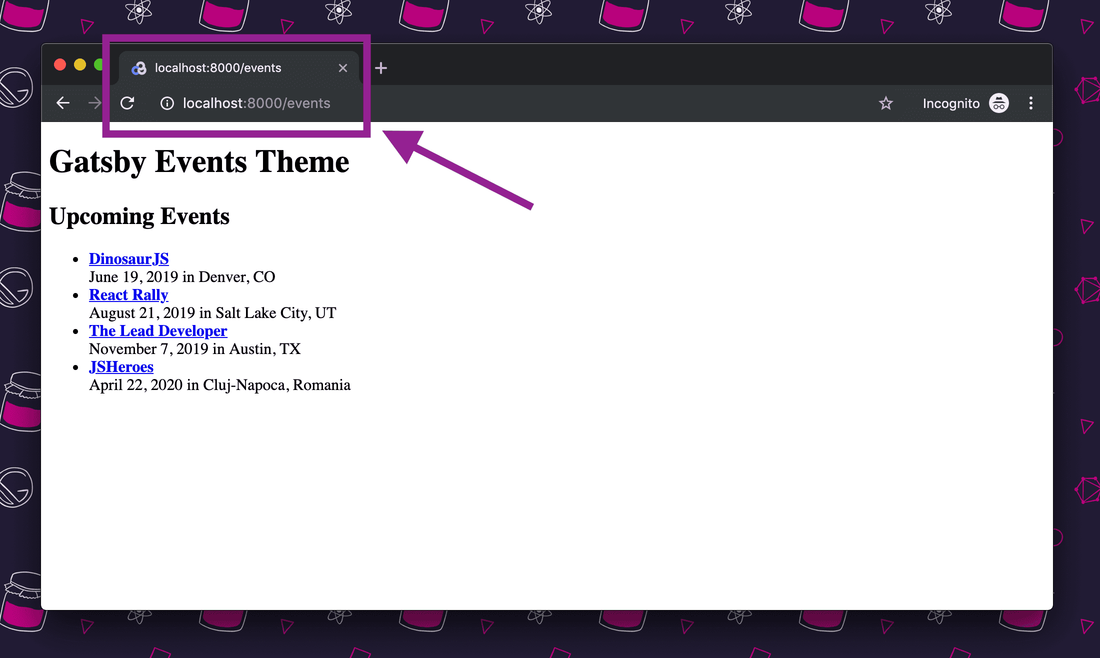 @jlengstorf/gatsby-theme-events, use the theme you just published instead! Or if you didn’t want to actually publish your test theme, go ahead and use@jlengstorf/gatsby-theme-events.