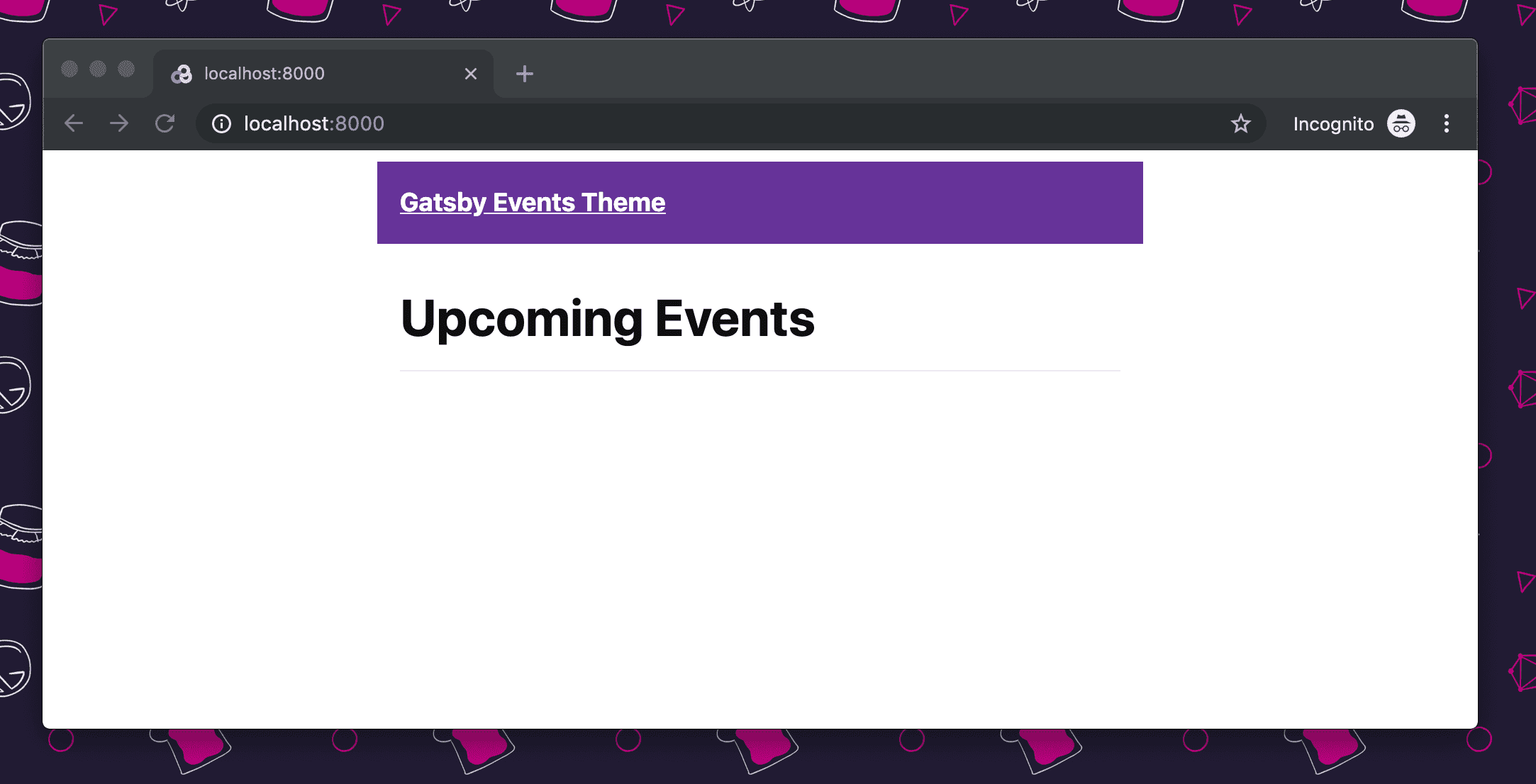 However, you don’t have any event data in the site. Copy the events.yml file from gatsby-theme-events/data into site/events. Then, restart the dev server: