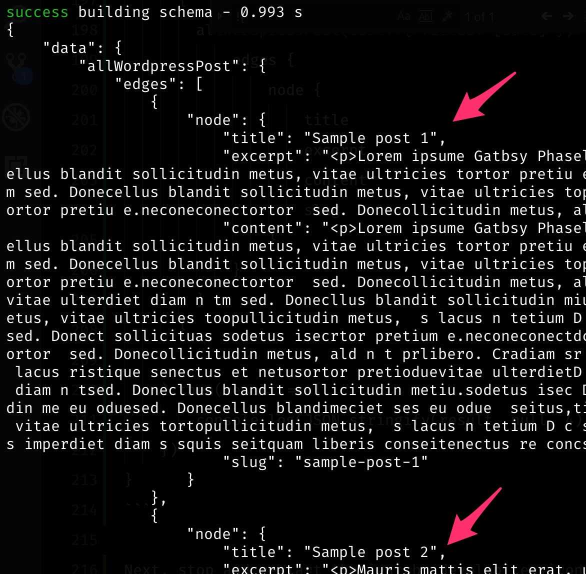 Next, stop and restart the gatsby develop environment. As you watch the terminal you should see two Post objects log to the terminal: